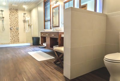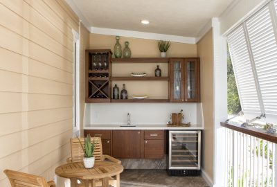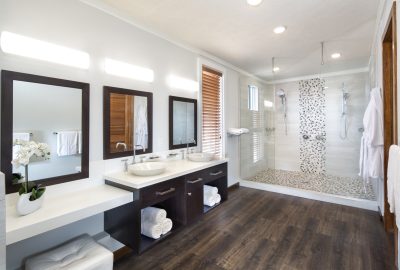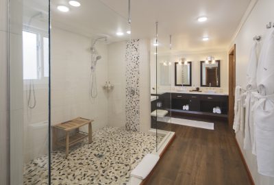 Inside, enjoy upscale, island-inspired custom furnishings, volume ceilings with rich wood accents, and a gorgeous bathroom with, dual sinks, professionally lit vanity mirrors, and a huge shower featuring 4 shower heads and pebbled basins with linen and pebbled tile wall accents.