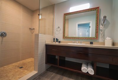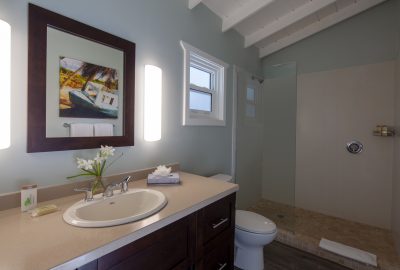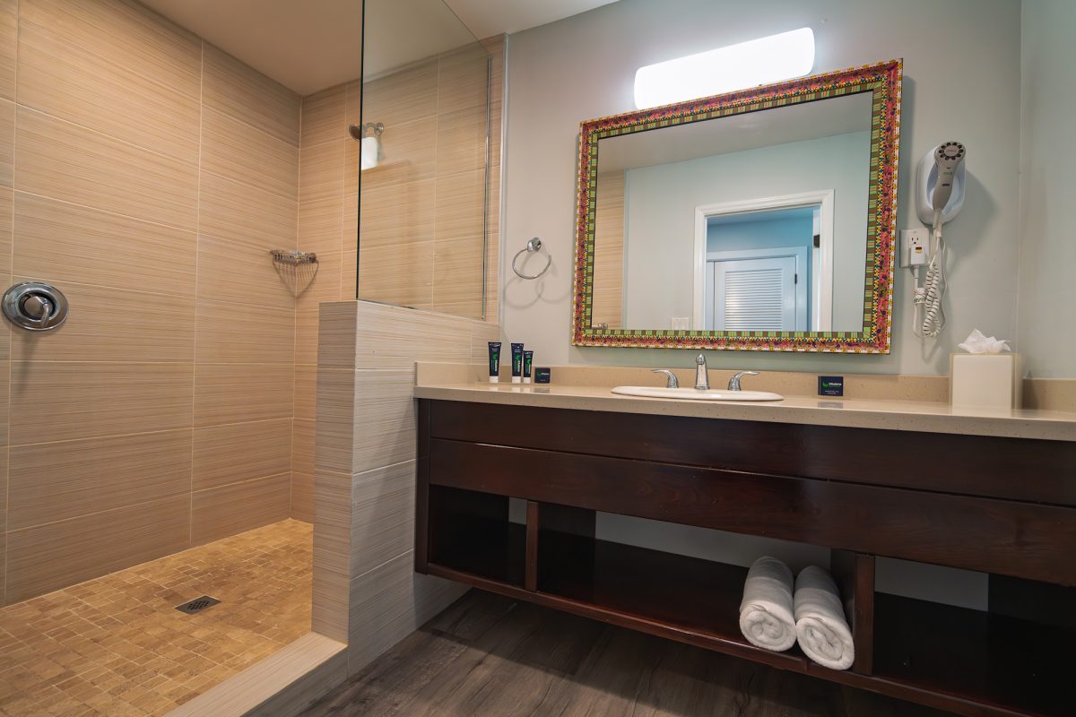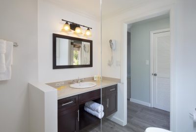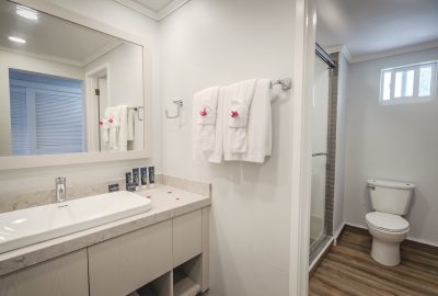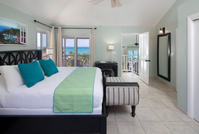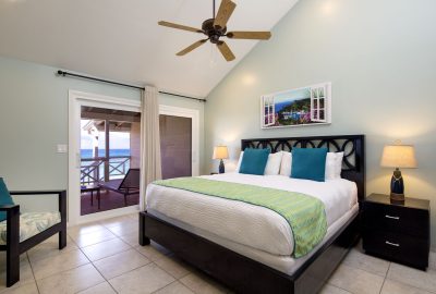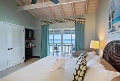 The Waterfront rooms have a king bed and a bathroom with shower. Rooms have either a private patio or balcony and enjoy stunning views of Long Bay beach.