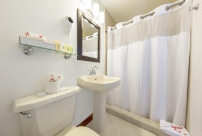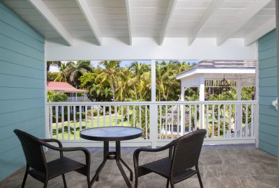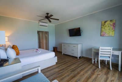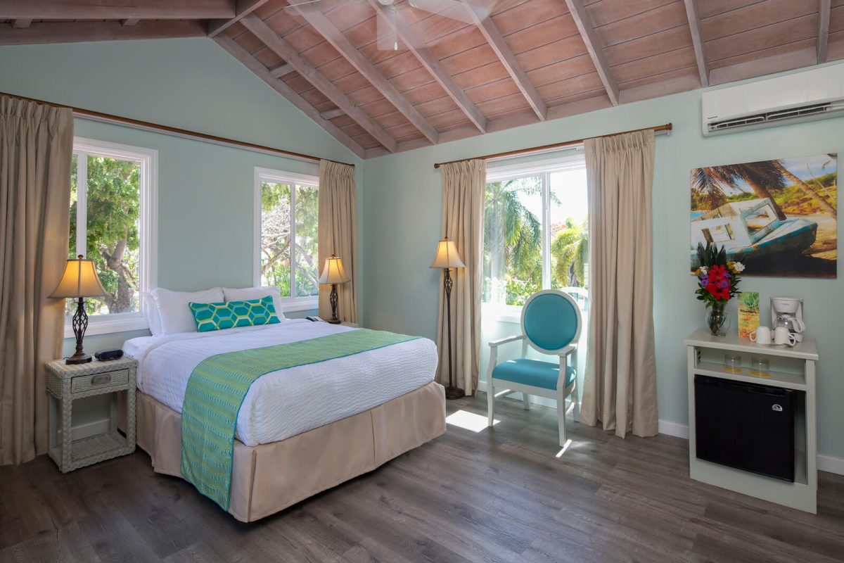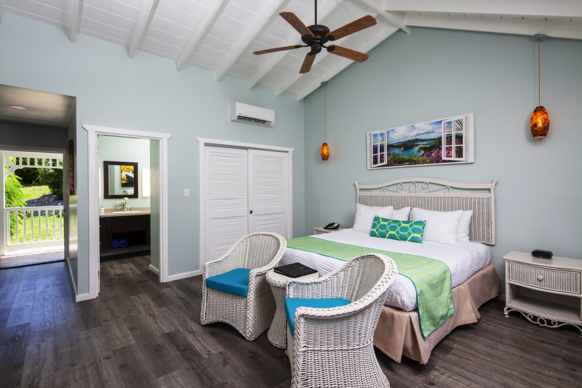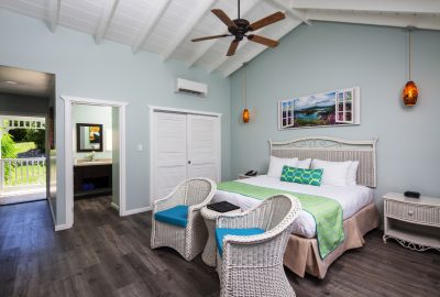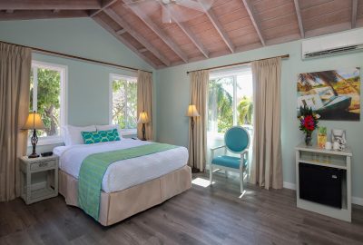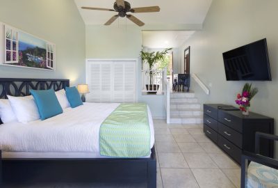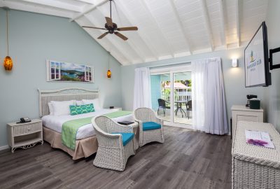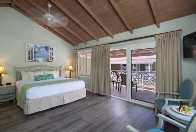 These rooms are set back in the two storey European styled Terrace Village buildings and features Caribbean furnishing with a modern hue and a king-sized bed. There is a bathroom with shower and a private patio or balcony. Rooms boast views of the surrounding gardens or the Tickled Turtle Pool.