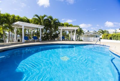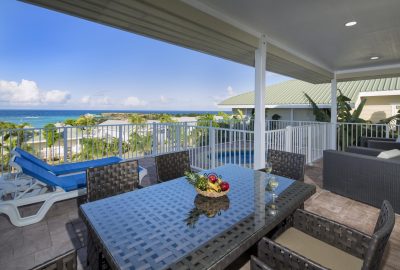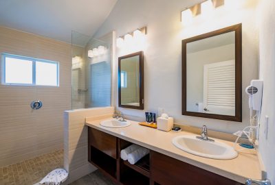 Our Two-Bedroom Villas offer one king bed, two queen beds and two full bathrooms, along with a spacious open-plan kitchen, living and dining area that opens onto a private balcony. You also have convenient access to the shared pool area for the villas just outside your door.